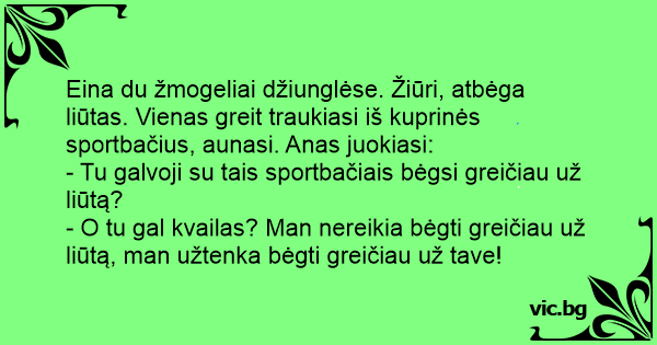 Eina du žmogeliai džiunglėse. Žiūri, atbėga liūtas. Vienas greit traukiasi iš kuprinės sportbačius, aunasi. Anas juokiasi: