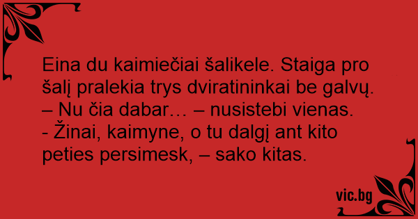 Eina du kaimiečiai šalikele. Staiga pro šalį pralekia trys dviratininkai be galvų. – Nu čia dabar… – nusistebi vienas.