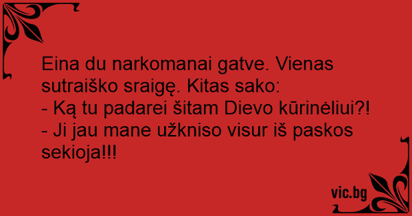Eina du narkomanai gatve. Vienas sutraiško sraigę. Kitas sako: