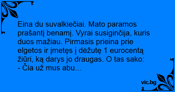 Eina du suvalkiečiai. Mato paramos prašantį benamį. Vyrai susiginčija, kuris duos mažiau. Pirmasis prieina prie elgetos ir įmetęs į dėžutę 1 eurocentą žiūri, ką darys jo draugas. O tas sako: