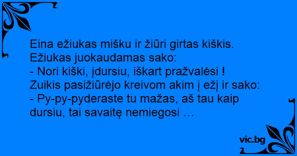 Eina ežiukas mišku ir žiūri girtas kiškis. Ežiukas juokaudamas sako:
