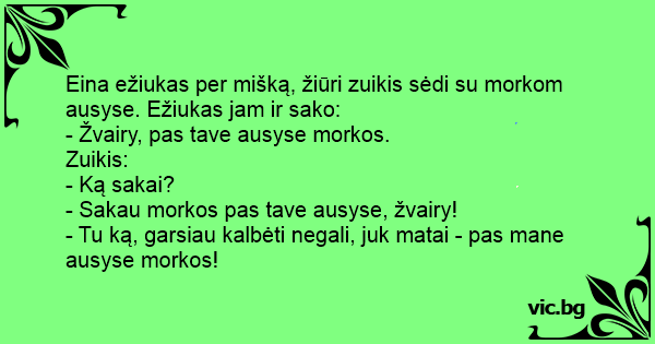 Eina ežiukas per mišką, žiūri zuikis sėdi su morkom ausyse. Ežiukas jam ir sako: