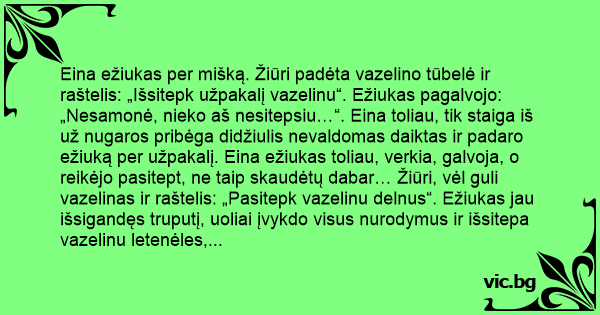 Eina ežiukas per mišką. Žiūri padėta vazelino tūbelė ir raštelis: „Išsitepk užpakalį vazelinu“. Ežiukas pagalvojo: „Nesamonė, nieko aš nesitepsiu…“. Eina toliau, tik staiga iš už nugaros pribėga didžiulis nevaldomas daiktas ir padaro ežiuką per užpakalį. Eina ežiukas toliau, verkia, galvoja, o reikėjo pasitept, ne taip skaudėtų dabar… Žiūri, vėl guli vazelinas ir raštelis: „Pasitepk vazelinu delnus“. Ežiukas jau išsigandęs truputį, uoliai įvykdo visus nurodymus ir išsitepa vazelinu letenėles, o čia kur buvęs, kur nebuvęs vėl atbėga didžiulis nevaldomas daiktas ir pradeda daryt ežiuką per burną. Ežiukas bando intensyviai priešintis, bet letenėlės taip slysta, taip slysta…