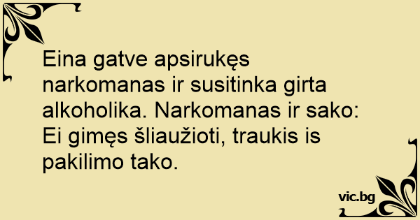 Eina gatve apsirukęs narkomanas ir susitinka girta alkoholika. Narkomanas ir sako: Ei gimęs šliaužioti, traukis is pakilimo tako.
