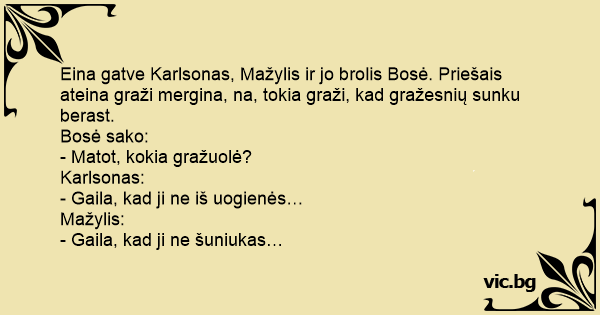 Eina gatve Karlsonas, Mažylis ir jo brolis Bosė. Priešais ateina graži mergina, na, tokia graži, kad gražesnių sunku berast.