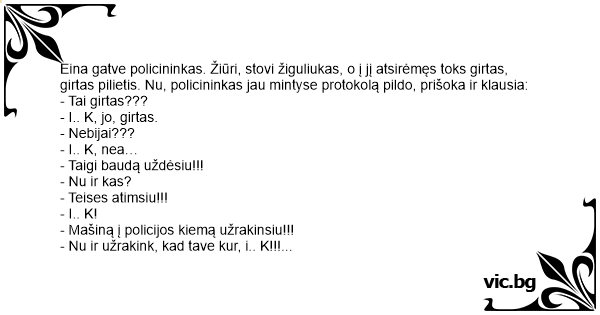 Eina gatve policininkas. Žiūri, stovi žiguliukas, o į jį atsirėmęs toks girtas, girtas pilietis. Nu, policininkas jau mintyse protokolą pildo, prišoka ir klausia: