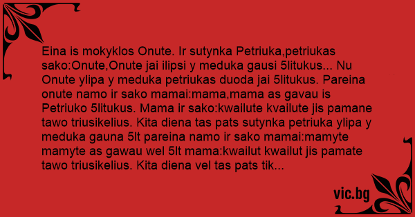 Eina is mokyklos Onute. Ir sutynka Petriuka,petriukas sako:Onute,Onute jai ilipsi y meduka gausi 5litukus... Nu Onute ylipa y meduka petriukas duoda jai 5litukus. Pareina onute namo ir sako mamai:mama,mama as gavau is Petriuko 5litukus. Mama ir sako:kwailute kvailute jis pamane tawo triusikelius. Kita diena tas pats sutynka petriuka ylipa y meduka gauna 5lt pareina namo ir sako mamai:mamyte mamyte as gawau wel 5lt mama:kwailut kwailut jis pamate tawo triusikelius. Kita diena vel tas pats tik kai pareina namo sako:mama,mama as gawau vel 5litukus. Mama:kwailut kwailut jis pamate tawo triusikelius Onute:nepergivenk mama sendien buwau be triusikeliu