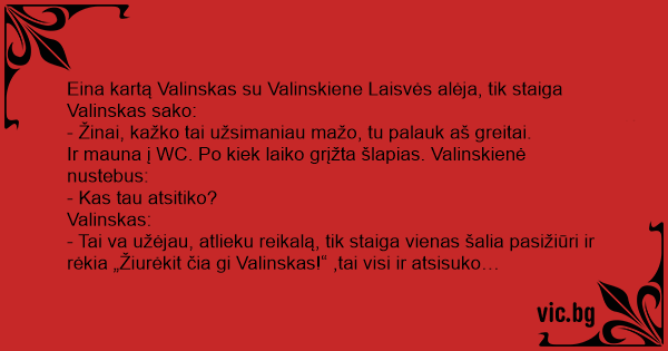 Ir mauna į WC. Po kiek laiko grįžta šlapias. Valinskienė nustebus: