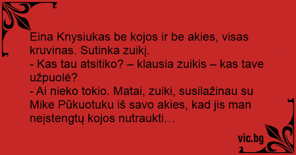 - Ai nieko tokio. Matai, zuiki, susilažinau su Mike Pūkuotuku iš savo akies, kad jis man neįstengtų kojos nutraukti…