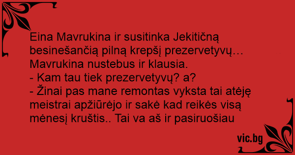 Eina Mavrukina ir susitinka Jekitičną besinešančią pilną krepšį prezervetyvų… Mavrukina nustebus ir klausia.