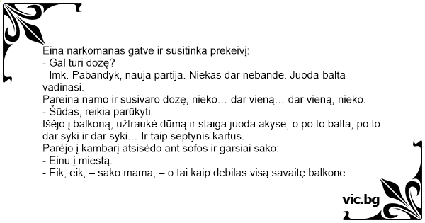 - Eik, eik, – sako mama, – o tai kaip debilas visą savaitę balkone prastovėjai!