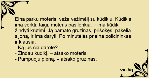 Eina parku moteris, veža vežimėlį su kūdikiu. Kūdikis ima verkti, taigi, moteris pasilenkia, ir ima kūdikį žindyti krūtimi. Ją pamato gruzinas, prišokęs, pakelia sijoną, ir ima daryti. Po minutėlės prieina policininkas ir klausia: