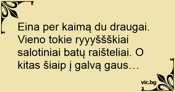 Eina per kaimą du draugai. Vieno tokie ryyyššškiai salotiniai batų raišteliai. O kitas šiaip į galvą gaus…