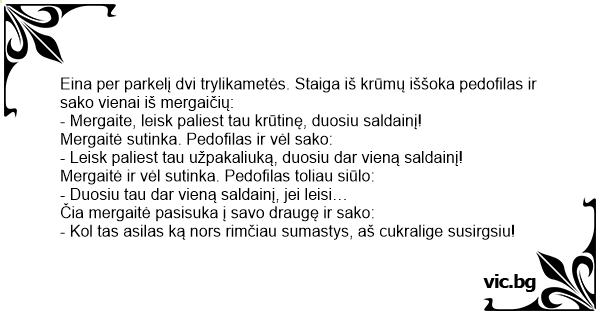 Eina per parkelį dvi trylikametės. Staiga iš krūmų iššoka pedofilas ir sako vienai iš mergaičių: