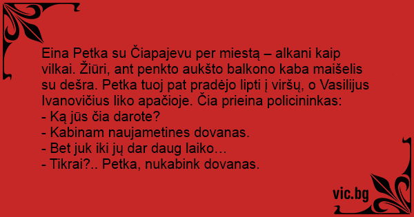 Eina Petka su Čiapajevu per miestą – alkani kaip vilkai. Žiūri, ant penkto aukšto balkono kaba maišelis su dešra. Petka tuoj pat pradėjo lipti į viršų, o Vasilijus Ivanovičius liko apačioje. Čia prieina policininkas: