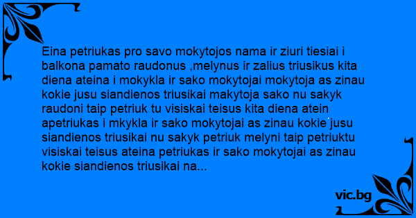 Eina petriukas pro savo mokytojos nama ir ziuri tiesiai i balkona pamato raudonus ,melynus ir zalius triusikus kita diena ateina i mokykla ir sako mokytojai mokytoja as zinau kokie jusu siandienos triusikai makytoja sako nu sakyk raudoni taip petriuk tu visiskai teisus kita diena atein apetriukas i mkykla ir sako mokytojai as zinau kokie jusu siandienos triusikai nu sakyk petriuk melyni taip petriuktu visiskai teisus ateina petriukas ir sako mokytojai as zinau kokie siandienos triusikai na sakyk petriuk zali ne sykarta neatspejai siandien as su stringais