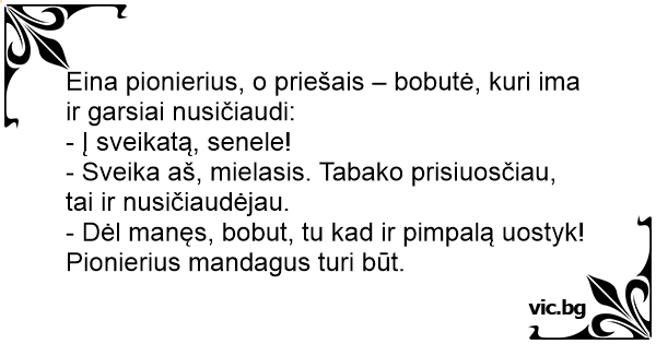 - Dėl manęs, bobut, tu kad ir pimpalą uostyk! Pionierius mandagus turi būt.