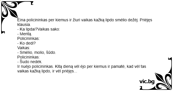 Ir nuėjo policininkas. Kitą dieną vėl ėjo per kiemus ir pamatė, kad vėl tas vaikas kažką lipdo, ir vėl priėjęs klausia:
