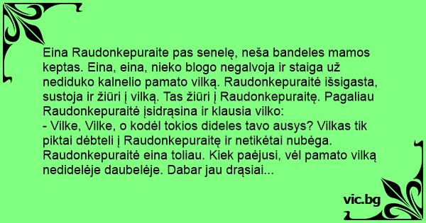 - Vilke, Vilke, o kodėl tokios didelės tavo akys? Ir tada vilkas, kad sustaugs ant Raudonkepuraitės: