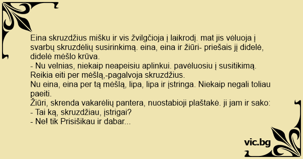 Eina skruzdžius mišku ir vis žvilgčioja į laikrodį. mat jis vėluoja į svarbų skruzdėlių susirinkimą. eina, eina ir žiūri- priešais jį didelė, didelė mėšlo krūva.