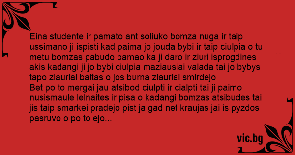Eina studente ir pamato ant soliuko bomza nuga ir taip ussimano ji ispisti kad paima jo jouda bybi ir taip ciulpia o tu metu bomzas pabudo pamao ka ji daro ir ziuri isprogdines akis kadangi ji jo bybi ciulpia maziausiai valada tai jo bybys tapo ziauriai baltas o jos burna ziauriai smirdejo