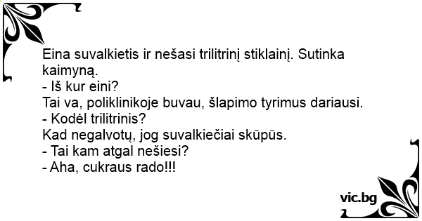 Eina suvalkietis ir nešasi trilitrinį stiklainį. Sutinka kaimyną.