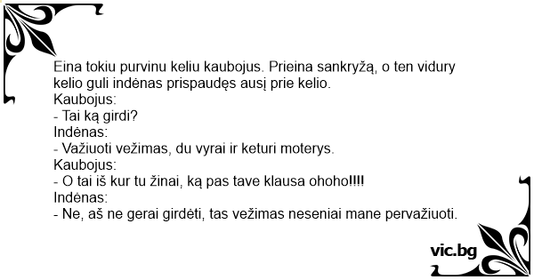 Eina tokiu purvinu keliu kaubojus. Prieina sankryžą, o ten vidury kelio guli indėnas prispaudęs ausį prie kelio.