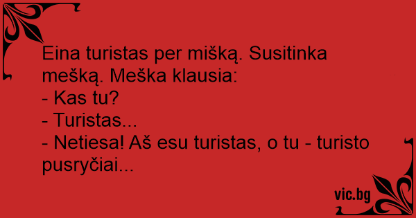 Eina turistas per mišką. Susitinka mešką. Meška klausia:
