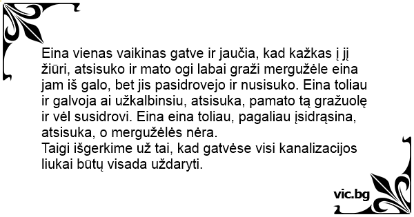 Eina vienas vaikinas gatve ir jaučia, kad kažkas į jį žiūri, atsisuko ir mato ogi labai graži mergužėle eina jam iš galo, bet jis pasidrovejo ir nusisuko. Eina toliau ir galvoja ai užkalbinsiu, atsisuka, pamato tą gražuolę ir vėl susidrovi. Eina eina toliau, pagaliau įsidrąsina, atsisuka, o mergužėlės nėra.