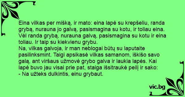 Eina vilkas per mišką, ir mato: eina lapė su krepšeliu, randa grybą, nurauna jo galvą, pasismagina su kotu, ir toliau eina. Vėl randa grybą, nurauna galvą, pasismagina su kotu ir eina toliau. Ir taip su kiekvienu grybu.