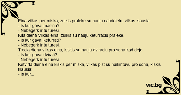 Eina vilkas per miska, zuikis praleke su nauju cabrioletu, vilkas klausia: