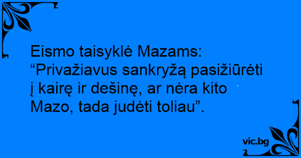 “Privažiavus sankryžą pasižiūrėti į kairę ir dešinę, ar nėra kito Mazo, tada judėti toliau”.