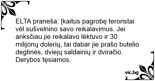 ELTA praneša: Įkaitus pagrobę teroristai vėl sušvelnino savo reikalavimus. Jei anksčiau jie reikalavo lėktuvo ir 30 milijonų dolerių, tai dabar jie prašo butelio degtinės, dviejų saldainių ir dviračio. Derybos tęsiamos.