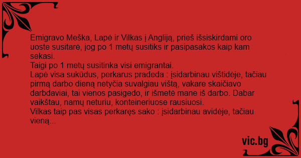 Meška visa išsipūtus ir stora sako : aš iš karto įsidarbinau statybose, ir pirma dieną suvalgiau 2 lenkus, tačiau vakare niekas lenkų neskaičiuoja.