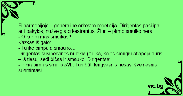Dirigentas susinervinęs nulekia į tuliką, kojos smūgiu atlapoja duris – iš tiesų, sėdi bičas ir smauko. Dirigentas:
