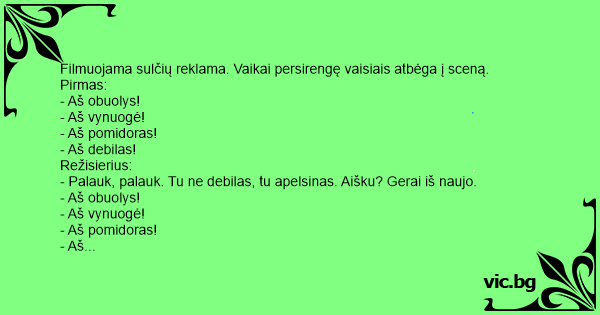 - Palauk! Tu ne debilas, tu apelsinas. Dabar aišku? Vėl iš pradžių.