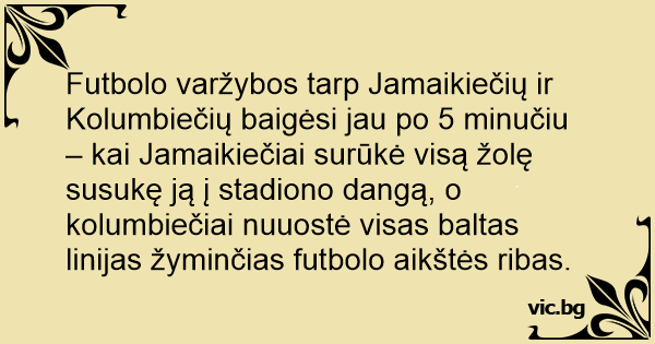 Futbolo varžybos tarp Jamaikiečių ir Kolumbiečių baigėsi jau po 5 minučiu – kai Jamaikiečiai surūkė visą žolę susukę ją į stadiono dangą, o kolumbiečiai nuuostė visas baltas linijas žyminčias futbolo aikštės ribas.