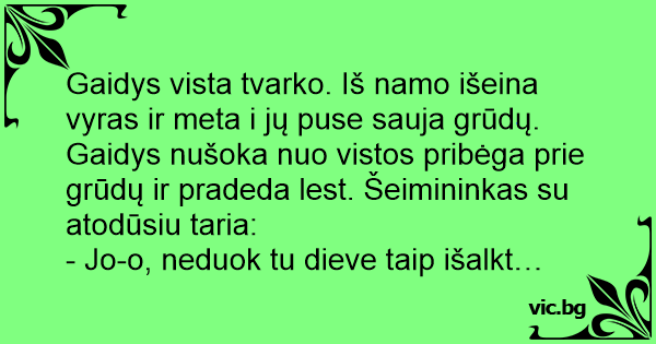 Gaidys vista tvarko. Iš namo išeina vyras ir meta i jų puse sauja grūdų. Gaidys nušoka nuo vistos pribėga prie grūdų ir pradeda lest. Šeimininkas su atodūsiu taria: