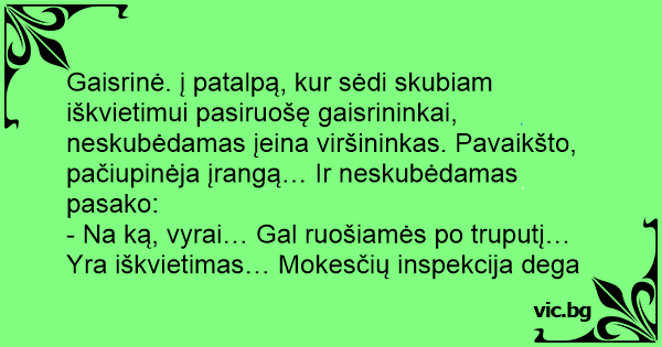 Gaisrinė. į patalpą, kur sėdi skubiam iškvietimui pasiruošę gaisrininkai, neskubėdamas įeina viršininkas. Pavaikšto, pačiupinėja įrangą… Ir neskubėdamas pasako: