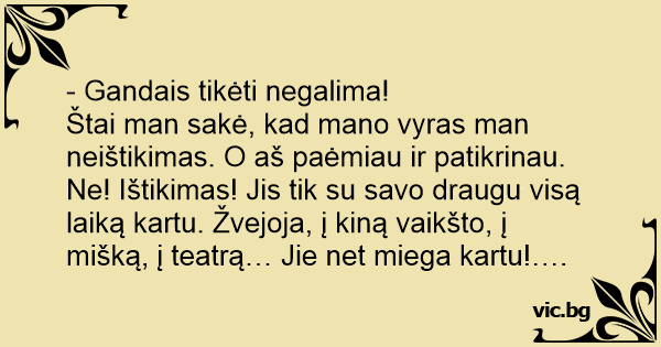 Štai man sakė, kad mano vyras man neištikimas. O aš paėmiau ir patikrinau. Ne! Ištikimas! Jis tik su savo draugu visą laiką kartu. Žvejoja, į kiną vaikšto, į mišką, į teatrą… Jie net miega kartu!….