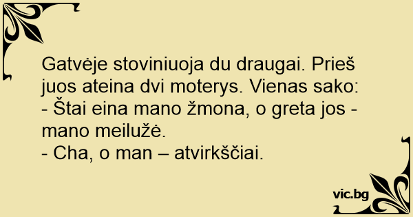 Gatvėje stoviniuoja du draugai. Prieš juos ateina dvi moterys. Vienas sako: