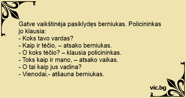 Gatve vaikštinėja pasiklydęs berniukas. Policininkas jo klausia: