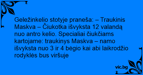 Geležinkelio stotyje praneša: – Traukinis Maskva – Čiukotka išvyksta 12 valandą nuo antro kelio. Specialiai čiukčiams kartojame: traukinys Maskva – namo išvyksta nuo 3 ir 4 bėgio kai abi laikrodžio rodyklės bus viršuje