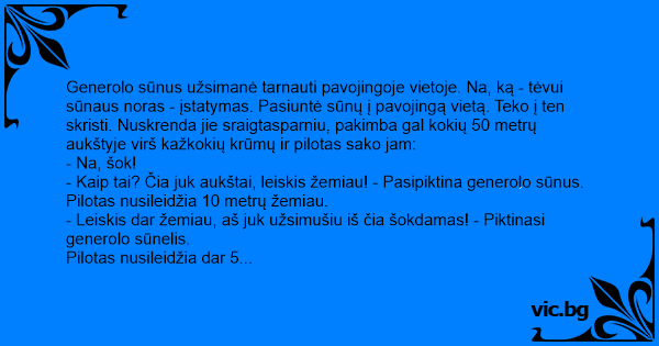 Generolo sūnus užsimanė tarnauti pavojingoje vietoje. Na, ką - tėvui sūnaus noras - įstatymas. Pasiuntė sūnų į pavojingą vietą. Teko į ten skristi. Nuskrenda jie sraigtasparniu, pakimba gal kokių 50 metrų aukštyje virš kažkokių krūmų ir pilotas sako jam: