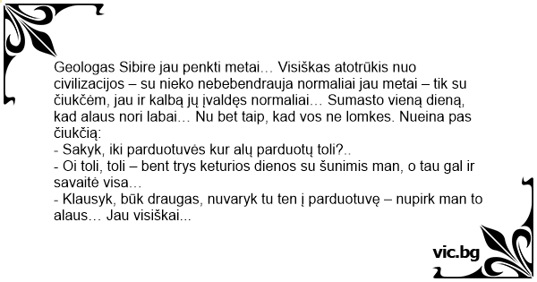 Geologas Sibire jau penkti metai… Visiškas atotrūkis nuo civilizacijos – su nieko nebebendrauja normaliai jau metai – tik su čiukčėm, jau ir kalbą jų įvaldęs normaliai… Sumasto vieną dieną, kad alaus nori labai… Nu bet taip, kad vos ne lomkes. Nueina pas čiukčią: