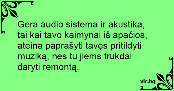 Gera audio sistema ir akustika, tai kai tavo kaimynai iš apačios, ateina paprašyti tavęs pritildyti muziką, nes tu jiems trukdai daryti remontą.