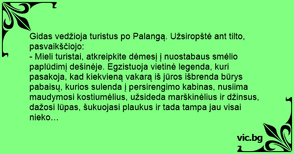 - Mieli turistai, atkreipkite dėmesį į nuostabaus smėlio paplūdimį dešinėje. Egzistuoja vietinė legenda, kuri pasakoja, kad kiekvieną vakarą iš jūros išbrenda būrys pabaisų, kurios sulenda į persirengimo kabinas, nusiima maudymosi kostiumėlius, užsideda marškinėlius ir džinsus, dažosi lūpas, šukuojasi plaukus ir tada tampa jau visai nieko…