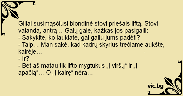 Giliai susimąsčiusi blondinė stovi priešais liftą. Stovi valandą, antrą… Galų gale, kažkas jos pasigaili: