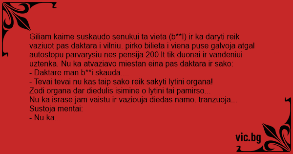 Giliam kaime suskaudo senukui ta vieta (b**I) ir ka daryti reik vaziuot pas daktara i vilniu. pirko bilieta i viena puse galvoja atgal autostopu parvarysiu nes pensija 200 lt tik duonai ir vandeniui uztenka. Nu ka atvaziavo miestan eina pas daktara ir sako: