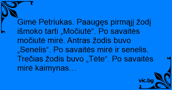 Gimė Petriukas. Paaugęs pirmąjį žodį išmoko tarti „Močiutė“. Po savaitės močiutė mirė. Antras žodis buvo „Senelis“. Po savaitės mirė ir senelis. Trečias žodis buvo „Tėte“. Po savaitės mirė kaimynas…